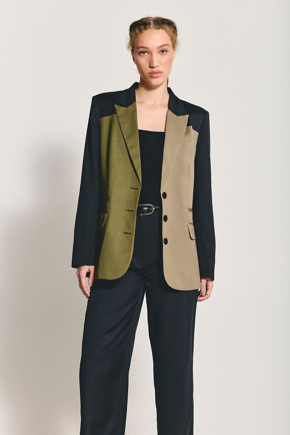 Calça cintura média em lã leve com modelagem reta. Fechamento frontal por zíper e ganho.